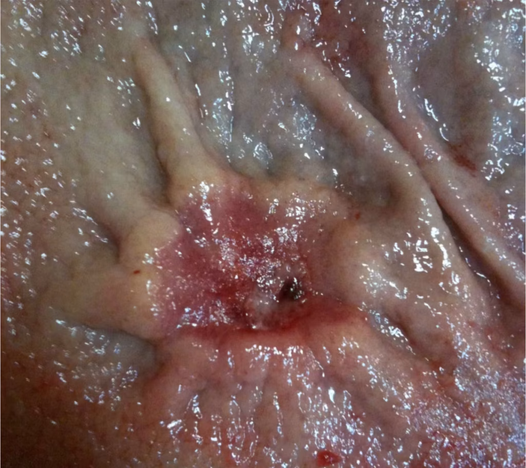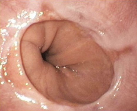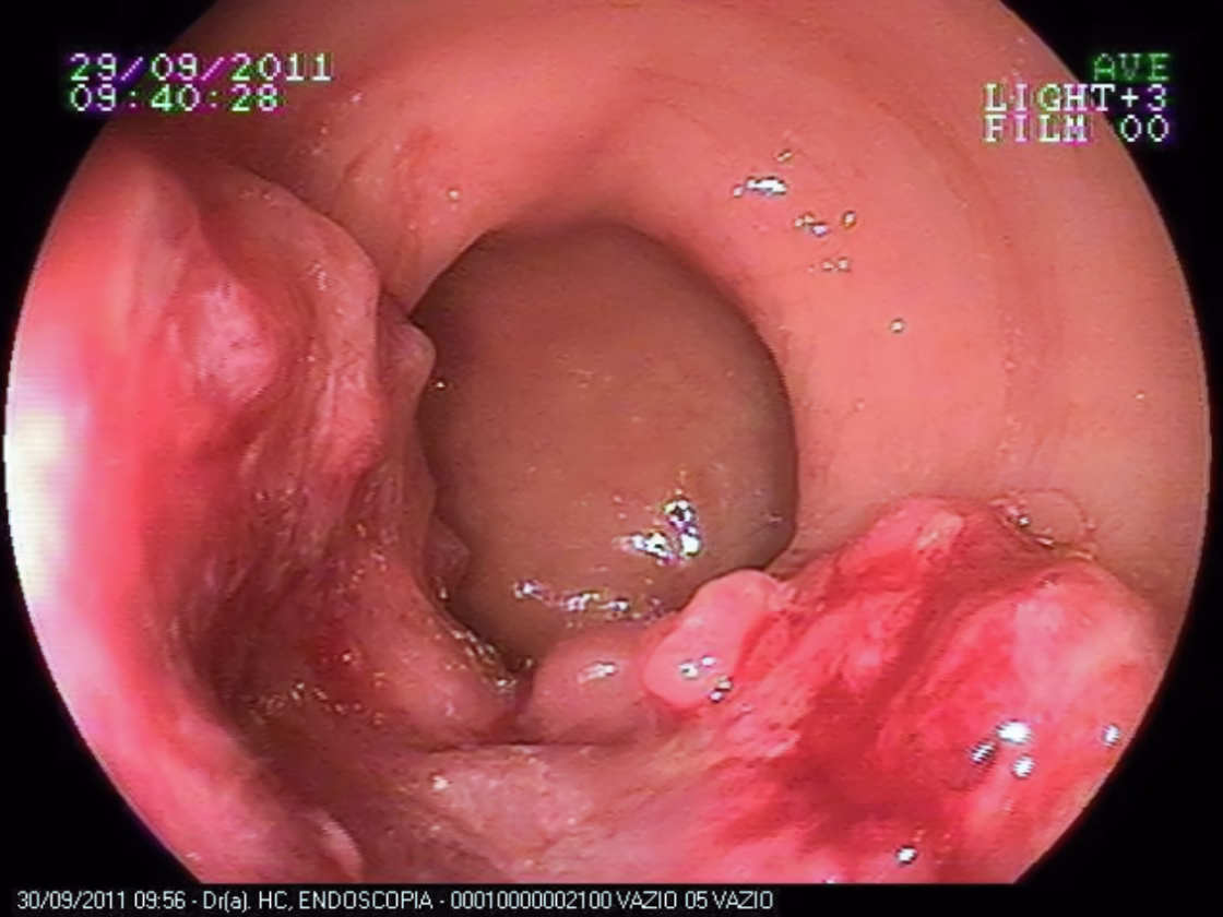 Figura ilustrando um exame de colonoscopia que diagnosticou câncer do intestino grosso