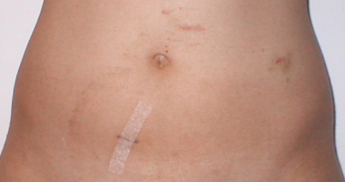 Foto evidenciando cicatrizes cirúrgicas pequenas pós colectomia realizada por câncer do intestino grosso.